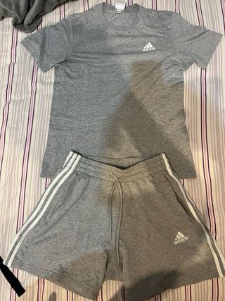 Vendo dos conjuntos deportivos, uno de Nike azul marino y otro de Adidas gris. El conjunto Nike incluye una sudadera con cremallera y pantalón deportivo; el conjunto Adidas, una camiseta de manga corta y pantalón corto. Ambos conjuntos están en perfecto estado.