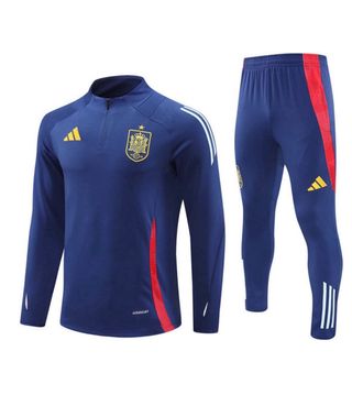 Conjunto deportivo de chándal de la selección española. - Chaqueta roja con detalles de las tres bandas. - Pantalón azul marino con ESPAÑA en lateral. - Escudo de España en la chaqueta.