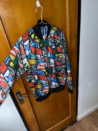 Chaqueta deportiva Adidas con un diseño llamativo y lleno de logos. - Cremallera frontal. - Puños y cintura elásticos.