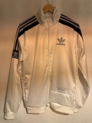 Chaqueta deportiva Adidas modelo Chile 26. - Color blanco con detalles en negro y gris. - Logo de Adidas y las tres rayas icónicas. - Cremallera frontal completa. - Bolsillos con cremallera.