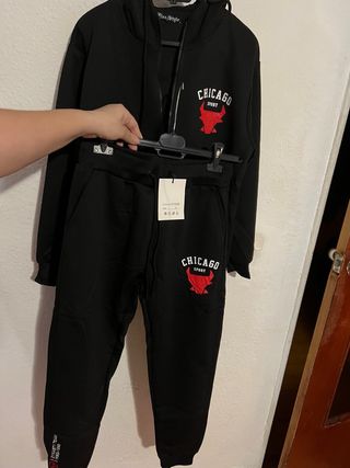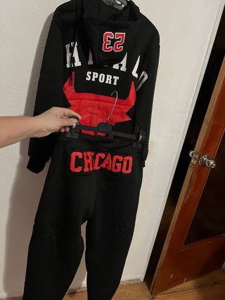 Se vende maravilloso y estupendo chandal completo la sudadera con capucha cremallera y bolsillos Sudadera Axila 49 Hombros 48 Largo 64 Pantalón con goma elástica Cintura 34 Largo 97 Nunca usado Conjunto de chándal completo con diseño deportivo. - Pantalón largo. - Estampado Chicago Sport con toro rojo. A estrenar