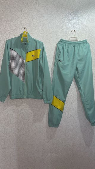 Conjunto deportivo de dos piezas de la marca Lacoste. - Chaqueta con cremallera completa y capucha. - Pantalón con cintura elástica y detalles laterales. Pago en mano Algeciras