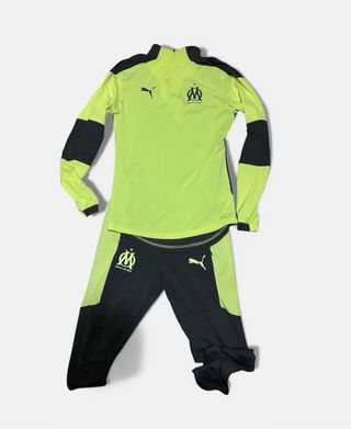 Conjunto deportivo de chándal del Olympique de Marsella. - Diseño moderno en verde lima y negro. - Logos de Puma y del club. - Ideal para entrenamientos o uso casual.