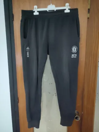 Chándal de Adidas con licencia oficial de la NBA, con el logo de los Brooklyn Nets. Talla l ( 44 de lado a lado de cintura sin estirar ) . Está pardo pero ni roto ni descosido - Diseño con el logo de Adidas y la NBA en la pierna izquierda. - Estampado del logo de los Brooklyn Nets y EST. 67 en la pierna derecha.
