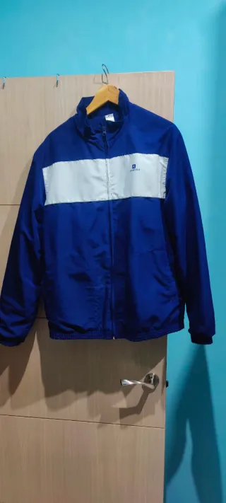 Chándal para hombre con un diseño moderno y deportivo. Apenas usado 3 veces se me ha quedado grande - Parte superior azul con banda horizontal blanca. - cinta blanca lateral en los pantalones - Cierre de cremallera frontal. - Cuello alto. - Puños y cintura elásticos.