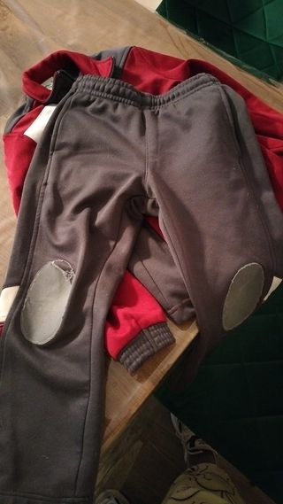 Conjunto de chándal escolar. - Chaqueta con cremallera, da problemas al abrir y cerrar. - Pantalón con rodilleras. - Diseño bicolor en rojo y gris.