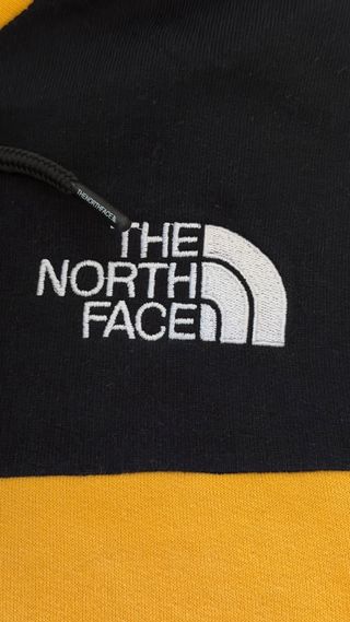 Sudadera con capucha de The North Face en color amarillo y negro. Diseño moderno y cómodo. PVP= 200€ - Capucha ajustable con cordones. - Bolsillo frontal tipo canguro. - Mangas largas con detalles en negro.