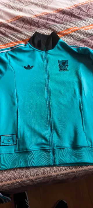 Conjunto de chándal Adidas del Liverpool. - Chaqueta azul con cremallera. - Pantalón negro. - Detalles de las tres rayas Adidas en blanco y azul. - Escudo del Liverpool bordado en ambas prendas. - Logo de Adidas bordado en ambas prendas.