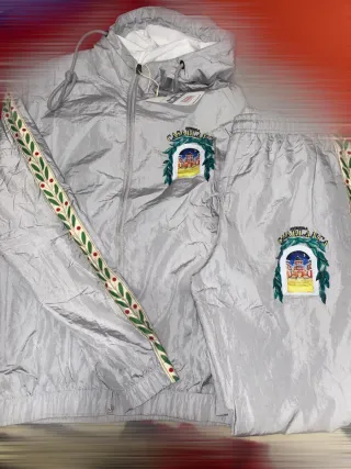 Conjunto deportivo del Racing de Santander. - Chaqueta con cremallera completa. - Pantalón con cordón ajustable en la cintura. - Escudo bordado del club en ambas prendas. - Detalles de la marca en las mangas y el pantalón.