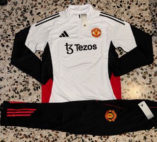 Conjunto de chándal del Manchester United. - Parte superior blanca con detalles negros y rojos. - Pantalón negro con detalles rojos.