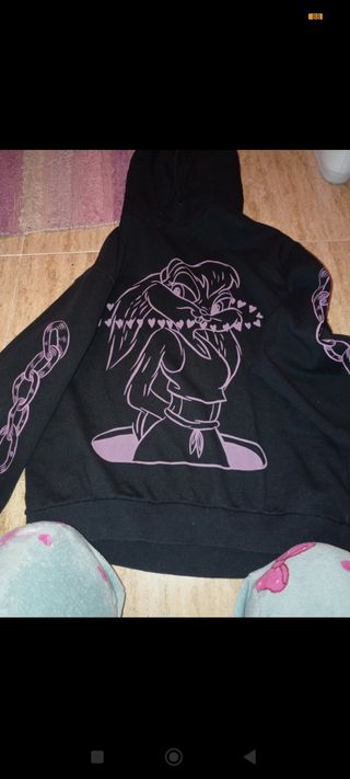 Chándal con dibujos de telaraña en ambas piernas, con liga elástica en la cintura y bolsillo a los lados. Nuevo sin estrenar, talla XXS. Medidas: cintura 29cm (debajo de la banda elástica) y largo 93cm.
