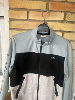 Chándal de niño de la marca Lacoste, con un diseño moderno y cómodo. - Paneles de color azul claro, negro y gris. - Logo de Lacoste en el pecho. - Inscripción de la marca en la manga. - Cremallera frontal completa. - Bolsillos laterales con cremallera.