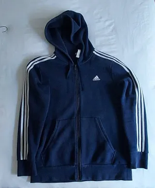 Chaqueta forro polar Adidas, talla L Chaqueta deportiva con cremallera completa y capucha. - Diseño con las icónicas tres rayas en las mangas. - Logo de Adidas bordado en el pecho. - Bolsillos frontales tipo canguro. - Tela de forro en el interior. Chandal, hombre, chandal niño, chandal joven, deporte, gimnasio.