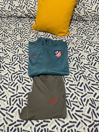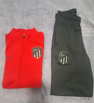 Conjunto deportivo oficial del Atlético de Madrid en perfecto estado. - Chaqueta con cremallera completa y escudo del club talla M. - Pantalón con cintura elástica y detalles de diseño talla S. - Logos de Nike y escudo del equipo bordados.