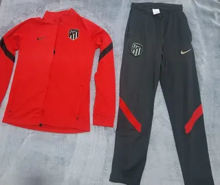 Conjunto de chándal del Atlético de Madrid. - Chaqueta deportiva. - Pantalón de chándal. - Logo de Nike en ambas prendas. - Escudo del Atlético de Madrid en la chaqueta.