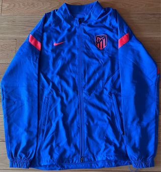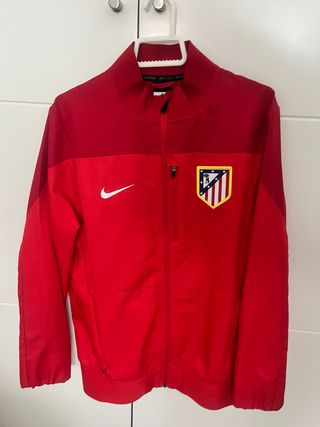 Chaqueta deportiva Atlético de Madrid de la marca Nike. - Diseño con franjas azules en las mangas. - Escudo del equipo en el pecho. (Existen algunas manchas en la chaqueta, adjuntas en la tercera fotografía)