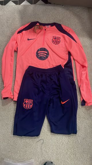 Chándal del FC Barcelona con un diseño moderno y deportivo. Pantalón talla L y chaqueta XL. - Cremallera frontal parcial. - Logo de Spotify en el pecho. - Escudo del FC Barcelona. - Logo de Nike.