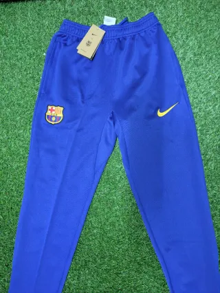 Pantalón deportivo del Fútbol Club Barcelona. - Logo del equipo en la pierna izquierda. - Swoosh de Nike en la pierna derecha. - Cremalleras en los bolsillos - parte de abajo ajustable con velcro (última foto)