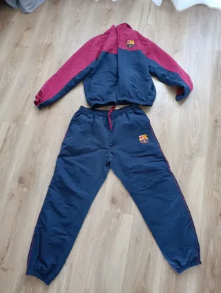 Conjunto deportivo del FC Barcelona. - Chaqueta con cremallera completa. - Pantalón con cintura elástica. - Escudo del FC Barcelona en ambas prendas. - Logo de Nike en la chaqueta. Talla s niño