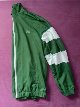 Chandal original lacoste. Chaqueta deportiva de la marca Lacoste, con un diseño moderno y llamativo. - Color principal verde con franja central blanca. - Logo de Lacoste bordado en el pecho. - Cuello alto y cierre de cremallera. - Puños y cintura elásticos.
