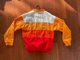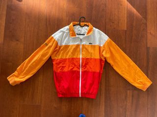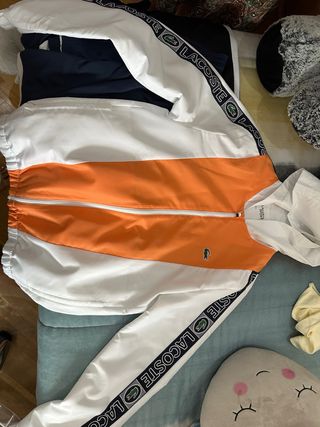 Preciosa chaqueta Lacoste de color blanco y naranja. Está en muy buen estado. - Tiene detalles en azul marino. - Cremallera frontal. - Bolsillos laterales.