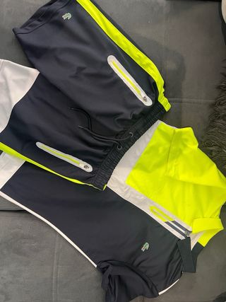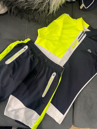 Conjunto deportivo Lacoste, ideal para entrenar o para el día a día. Está en perfecto estado Talla L - Incluye camiseta y pantalón corto. - Diseño moderno y elegante. - Tejido transpirable y cómodo.