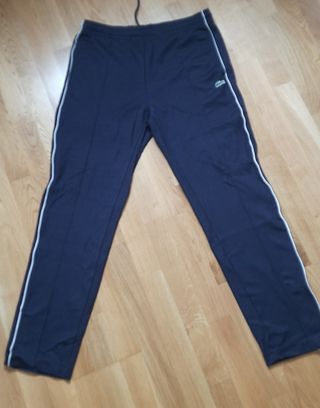Chándal deportivo de la marca Lacoste. - Color azul marino. - Diseño con detalles blancos en la pierna. - Logo de Lacoste en la parte superior izquierda.