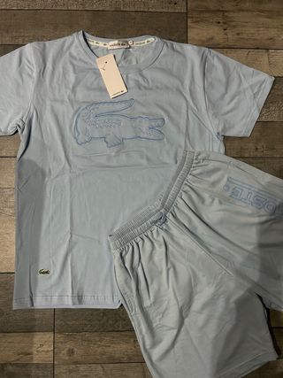 Conjunto de verano de la marca Lacoste. - Camiseta con logo de cocodrilo blanco. - Pantalón corto con cordón. - Logo de Lacoste en el pantalón. Hago envío y entrega a mano