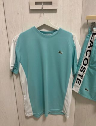 Conjunto deportivo de la marca Lacoste, ideal para actividades al aire libre o para el día a día. Incluye camiseta y pantalón corto. - Camiseta con diseño en color blanco, negro y detalles en rosa. - Pantalón corto con cintura elástica y cordón. - Incluye gorra negra. - También se incluye un par de calzoncillos negros.