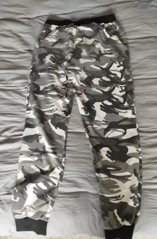 Pantalón de chándal con estampado militar. Es cómodo y tiene un diseño moderno. - Estampado de camuflaje en tonos grises y negros. - Cintura con cordón ajustable. - Puños elásticos en los tobillos.