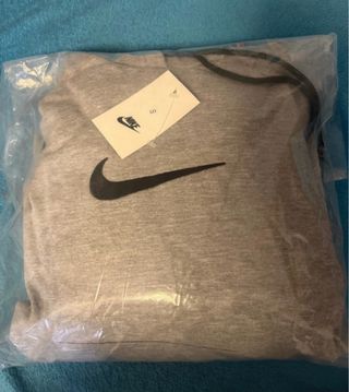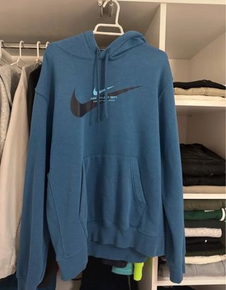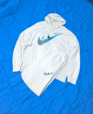 Conjunto completo de Nike en estado impecable. Apenas ha tenido uso y se ha conservado perfectamente. El tejido mantiene el color azul marino intenso original y los elásticos están como nuevos. Estado: 9.5/10. Sin bolitas, enganchones ni desgaste en los logos. Corte: Sudadera con capucha y pantalón tipo jogger con ajuste en el tobillo. Detalles: 100% original. Etiquetas interiores disponibles en las fotos para verificación. El chándal se entrega totalmente limpio y revisado. Si necesitas alguna medida específica, no dudes en consultar. Envíos rápidos en menos de 24h