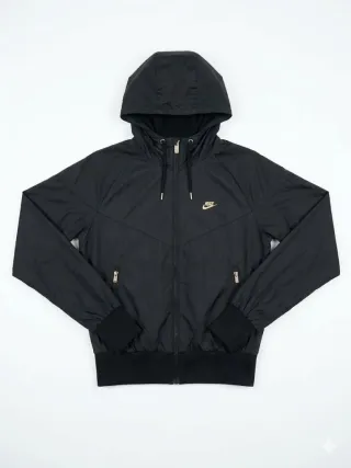 Chaqueta deportiva Nike en color negro, con diseño moderno y capucha. - Cierre de cremallera frontal. - Bolsillos laterales con cremallera. - Puños y cintura elásticos. - Logo de Nike bordado en el pecho.
