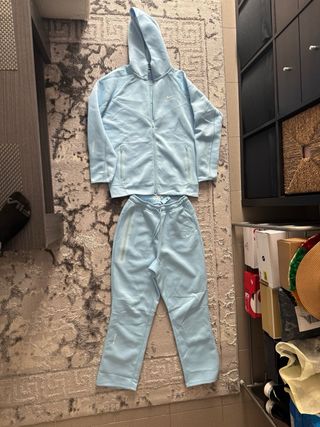 Conjunto de chándal Nike Tech Fleece en tonos azul y gris. Incluye sudadera con capucha y pantalón. Solo dos veces puesto. PRECIO EN TIENDA 110€ - Sudadera con cremallera completa. - Bolsillo con cremallera en la manga. - Cintura elástica con cordón en el pantalón.