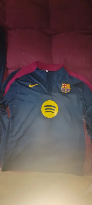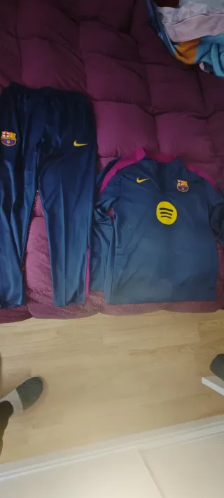 Conjunto deportivo del FC Barcelona. - Pantalón largo azul. - Sudadera azul con detalles morados y logo de Spotify. - Escudo del FC Barcelona y logo de Nike. Usado 2 horas, pero me queda un poco grande y por eso lo vendo