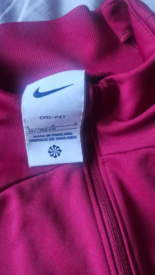 Conjunto de chándal del FC Barcelona. - Chaqueta con cremallera completa. - Pantalón largo. - Escudo del club bordado. - Logo de Nike. - Detalles en color rosa. Talla L de niño 12-13 años