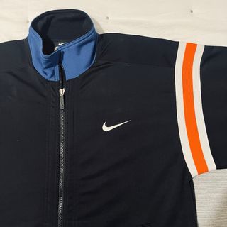 Chándal vintage de Nike con un diseño deportivo y moderno. Perfecto para un estilo casual. - Diseño con franjas naranjas y blancas en las mangas. - Cuello alto azul. - Cremallera frontal completa. - Dos bolsillos laterales. - Forro interior negro.