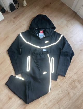 Conjunto deportivo Nike Tech con detalles reflectantes. - Sudadera con capucha y cremallera completa. - Pantalón con cintura elástica y bolsillos con cremallera. - Diseño moderno con líneas reflectantes.