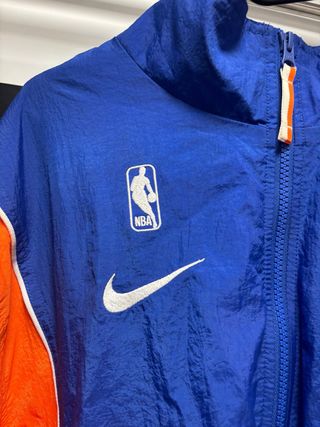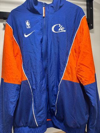 Chándal oficial de Nike con licencia de la NBA, inspirado en los Cleveland Cavaliers. Presenta un diseño llamativo en azul y naranja. - Logo de la NBA bordado. - Swoosh de Nike bordado. - Cremallera frontal con tirador de cinta.