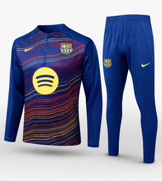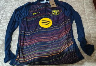Top de entrenamiento pre-partido del FC Barcelona para la temporada 25/26. Presenta un diseño vibrante y moderno. - Media cremallera frontal. - Mangas largas. - Logo del club y patrocinador visibles.