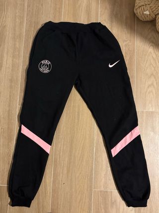 Conjunto deportivo del Paris Saint-Germain. - Pantalón largo negro con detalles rosas. - Logo del PSG en la pierna izquierda. - Símbolo de Nike en la pierna derecha.