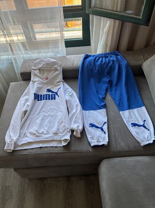 Conjunto de chándal compuesto por sudadera con capucha y pantalón. - Sudadera blanca con logo Puma azul. - Pantalón azul con detalles blancos y logo Puma en los bajos. 90% fabricado con algodón y 10% de elastano Fabricado en Portugal Sin usar muy cómodo para hacer deporte
