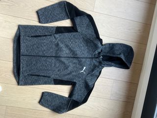 Chaqueta deportiva con cremallera completa y capucha. - Diseño moderno en color gris jaspeado. - Paneles laterales y mangas en contraste. - Dos bolsillos frontales con cremallera.