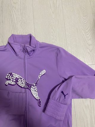 Conjunto deportivo de dos piezas de la marca Puma. - Chaqueta con cremallera completa y cuello alto. - Pantalón con cintura elástica y puños ajustados. - Logo de Puma bordado en la chaqueta y el pantalón.