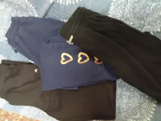 Lote de tres pantalones de chándal. - Talla XS, equivalente a 34 o 6. - Ideal para adolescentes de 14-16 años. - Uno de ellos es azul con detalles dorados en forma de corazón.