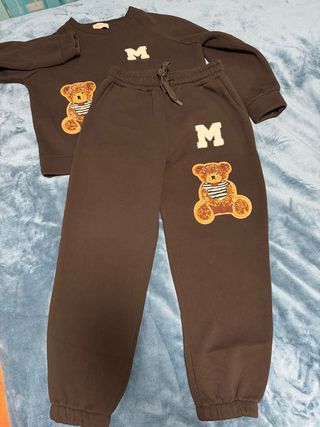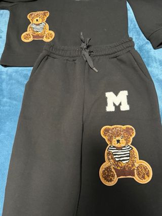 Conjunto de chándal con estampado de oso y detalle de la letra M. - Sudadera con cuello redondo. - Pantalón con cordón ajustable en la cintura. - Diseño divertido y original.