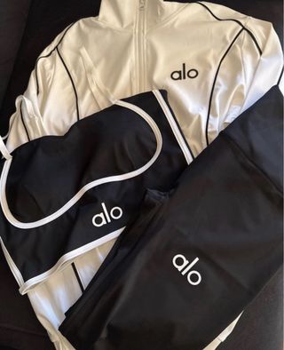 Conjunto deportivo de Alo Yoga. - Chaqueta deportiva con cremallera. - Sujetador deportivo. - Pantalones deportivos. - Logo de Alo en cada prenda.