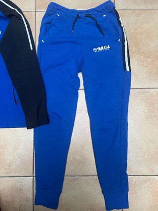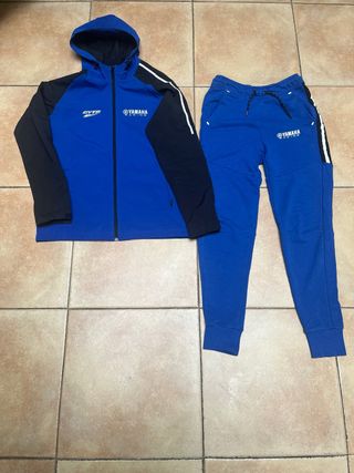 Conjunto de chándal deportivo Yamaha. - Chaqueta con capucha y cremallera completa. - Pantalón con cordón ajustable en la cintura. - Diseño deportivo con detalles en contraste.