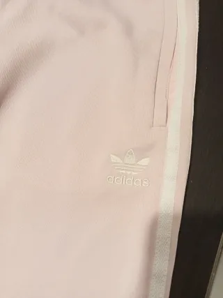 Chándal Adidas de color rosa, talla M. Ideal para un look deportivo y cómodo. - Cintura elástica con cordón. - Tres rayas blancas laterales. - Logo de Adidas bordado.
