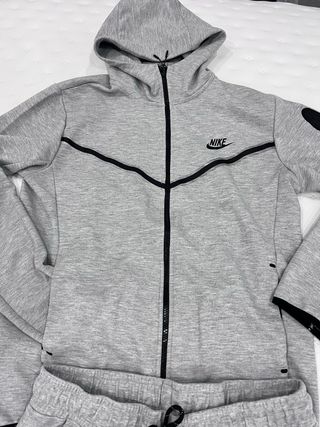 Conjunto de chándal Nike Tech Fleece en color gris. - Diseño moderno con detalles en negro. - Cremallera completa en la sudadera. - Cintura elástica con cordón en el pantalón. Tallaje aproximado para 170-180cm