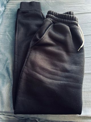 Pack de dos pantalones de chándal cómodos y versátiles. Tienen vellón por dentro por lo que son muy calentitos y perfectos para el invierno.Tienen en algunas partes bolitas que no se aprecian hasta que no te acercas( adjunto foto). - Cintura elástica con cordón. - Bolsillos laterales. - Tejido suave y agradable.